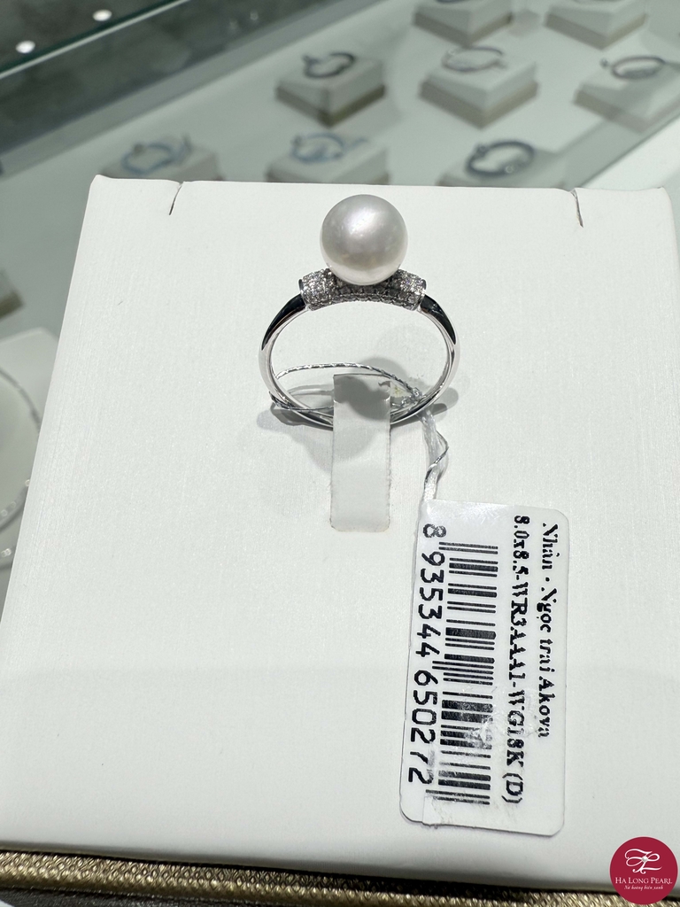 1. Tên sản phẩm: Nhẫn ngọc trai Akoya 63A803G028 (Đ.1200) 2. Xuất xứ: Việt Nam. 3. Thành phần - Ngọc trai Akoya - Đai sản phẩm: Vàng trắng 18K và đá nhân tạo 4. Thông số: - Kích thước: 8.0x8.5 mm - Màu sắc: Trắng - Hình dạng: Tròn - Chất lượng viên ngọc: Chất lượng AAA - Đai sản phẩm: Vàng trắng 18K và đá nhân tạo